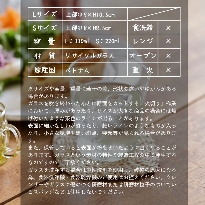 ハンドメイドならではの、ガラス表面に生まれるわずかな“しわ”や小さな気泡、繊細な表情の違いなどをお楽しみいただけると思います。