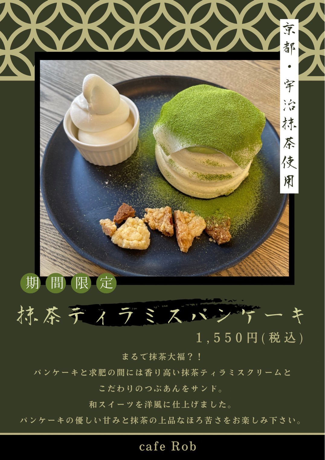 パンケーキの優しい甘みと京都宇治抹茶の上品なほろ苦さをお楽しみください😊