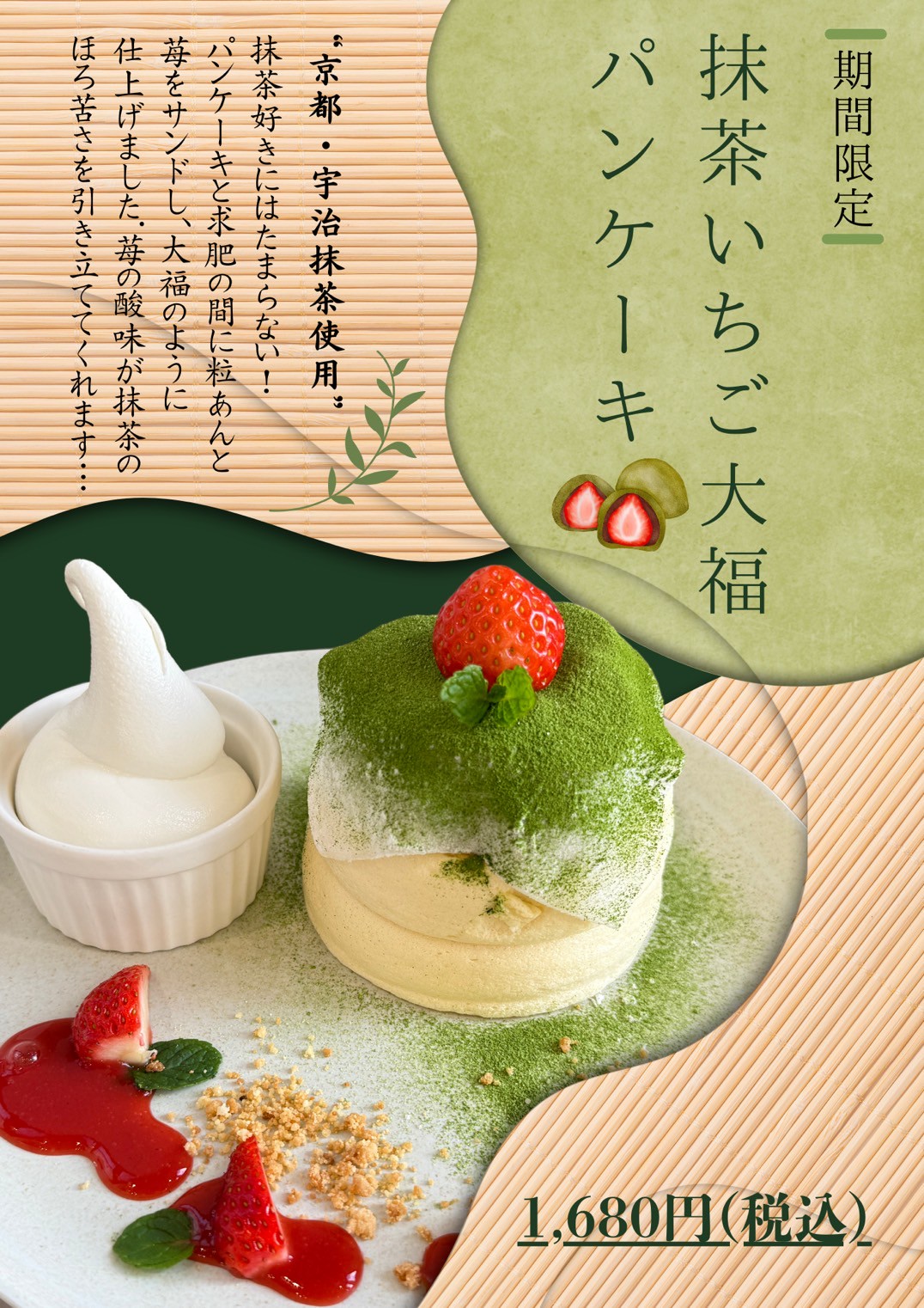 SHOP NEWS最新情報 姫路市 雑貨店 PORTUS > イベント情報 > 1/24(土)START!抹茶いちご大福パンケーキ🍓 2026.01.221/24(土)START!抹茶いちご大福パンケーキ🍓 こんにちは!Portusです🌱1/24(土)より季節限定メニューが始まります🍵 🍓抹茶いちご大福パンケーキ 1,680 yen 京都・宇治抹茶使用! 抹茶好きにはたまらない💕パンケーキと求肥の間に粒あんと苺をサンド。まるでいちご大福のように仕上げました🍓苺の酸味が抹茶のほろ苦さを引き立ててくれます。 期間中皆様のご来店を心よりお待ちしております😊 Portusスタッフ ■SHOP INFORMATION■お買い物ガイド ○送料について お買物商品の合計が6,600円(税込)で送料無料※限定イベントの開催時には、送料無料条件が変わることがございます。 ○お届けについて 注文日より3営業日以内に発送します。 お届けについてはこちら→ ○お支払いについて クレジットカードがご利用になれます。 詳細はこちら→